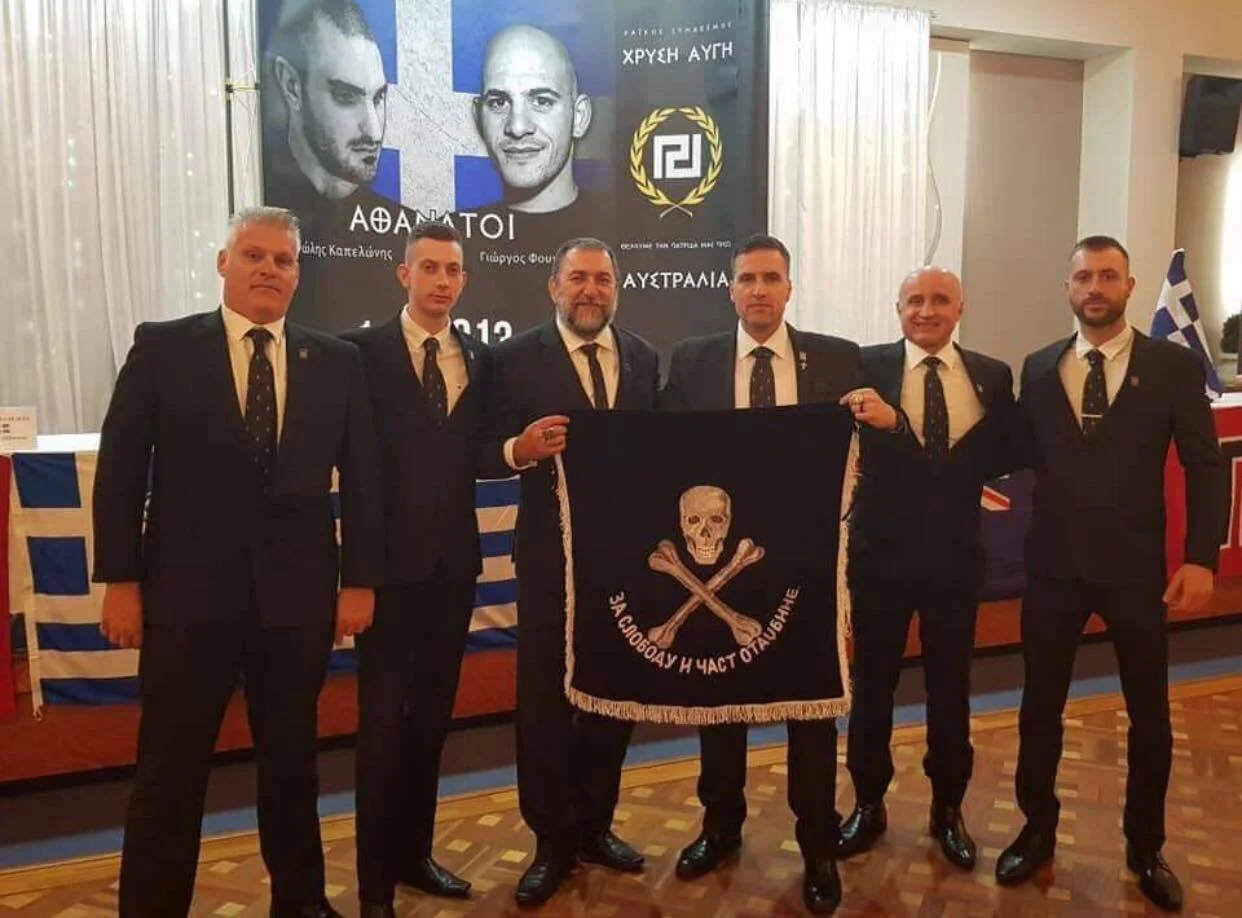 The leadership of the NSW Serbian Chetnik RSL (holding Chetnik flag) with neo-Nazi Greek Golden Dawn members, Sydney, 2018 / Facebook.