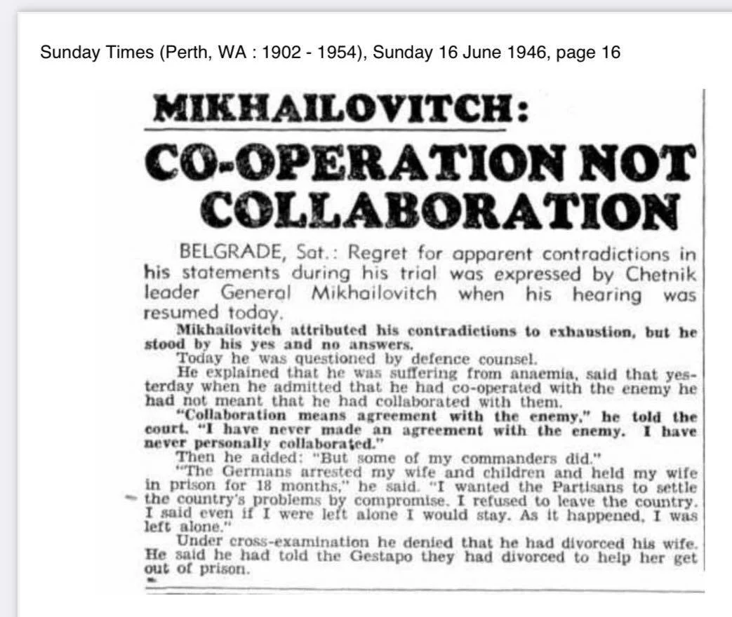 In fact, Chetnik leader Draza Mihailovich, far from fighting the Germans, admitted at his trial in 1946 that he secretly co-operated with them for most of World War 2.